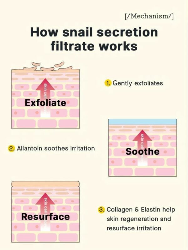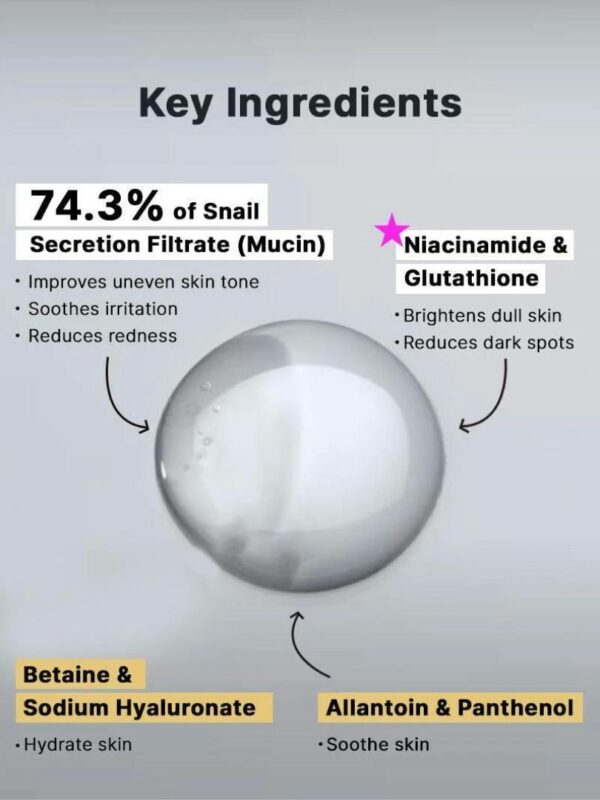 - 74,3% Triple Snail Complex : Ένα σύμπλεγμα που συνδυάζει τις ενυδατικές ιδιότητες και το plumping effect του διηθήματος έκκρισης σαλιγκαριού με τα οφέλη αντιγήρανσης και μείωσης των πόρων από το διήθημα μαύρων σαλιγκαριών και την αντιβακτηριακή, αντιοξειδωτική UV προστασία των gold snails.