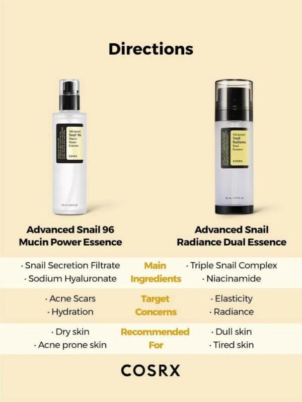 Το Cosrx Advanced Snail Radiance Dual Essence είναι ένα διπλό essence που συνδυάζει τα οφέλη της βλεννίνης σαλιγκαριού και την νιασιναμίδης. Μια αντλία, δυο πανίσχυρα συστατικά, ένας συνδυασμός που φωτίζει, ενυδατώνει, συσφίγγει και αφήνει την επιδερμίδα πιο ελαστική και plumped. Το εκκριμμα σαλιγκαριού κάνει απαλή απολέπιση, η αλλαντοίνη ηρεμεί και καταπραύνει, το κολλαγόνο και η ελαστίνη αναγεννούν τα κύτταρα και την επιδερμίδα.