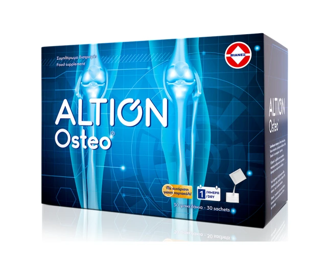 Το ALTION Osteo είναι ένα κλινικά μελετημένο συμπλήρωμα διατροφής που περιέχει θειική γλυκοζαμίνη, θειική χονδροϊτίνη, υδρολυμένο κολλαγόνο, μεθυλοσουλφονυλομεθάνιο (MSM), βιταμίνη C και L-καρνιτίνη.