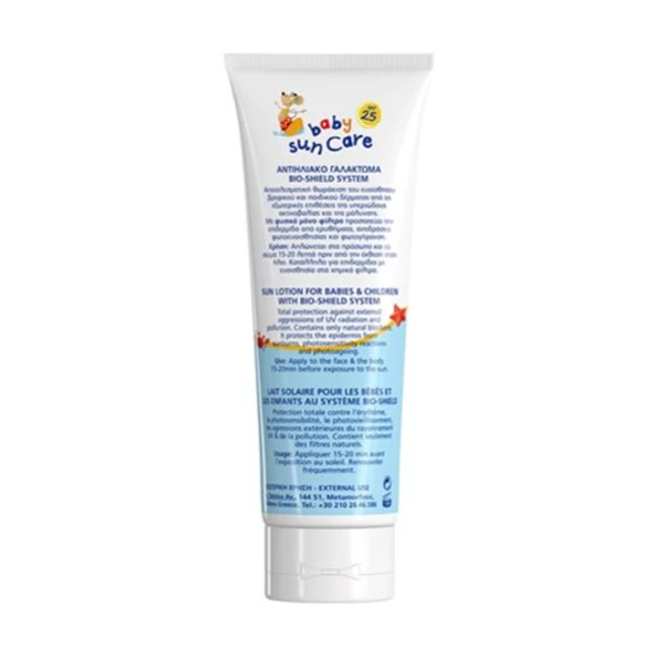 Αντηλιακό γαλάκτωμα προσώπου και σώματος για βρέφη, μόνο με φυσικά φίλτρα. Έχει σύνθεση εμπλουτισμένη με Βιταμίνη Ε και Πανθενόλη και είναι ειδικά σχεδιασμένη για να σέβεται τη φυσιολογία του ευαίσθητου βρεφικού δέρματος. Παράλληλα, θωρακίζει το DNA των κυττάρων του δέρματος και παρέχει προστασία από τις ελεύθερες ρίζες που προκαλούνται από εξωγενείς παράγοντες, όπως ο ήλιος και η ατμοσφαιρική ρύπανση.