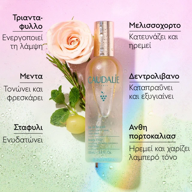 Λατρεμένο προϊόν της Caudalie, 100% φυσικό, το Beauty Elixir ψεκάζεται στην επιδερμίδα προσφέροντάς της πολλαπλά οφέλη. Αποκαλύπτει τη λάμψη τoυ τόνου της επιδερμίδας και συσφίγγει τους πόρους ενώ ταυτόχρονα σταθεροποιεί το μακιγιάζ.