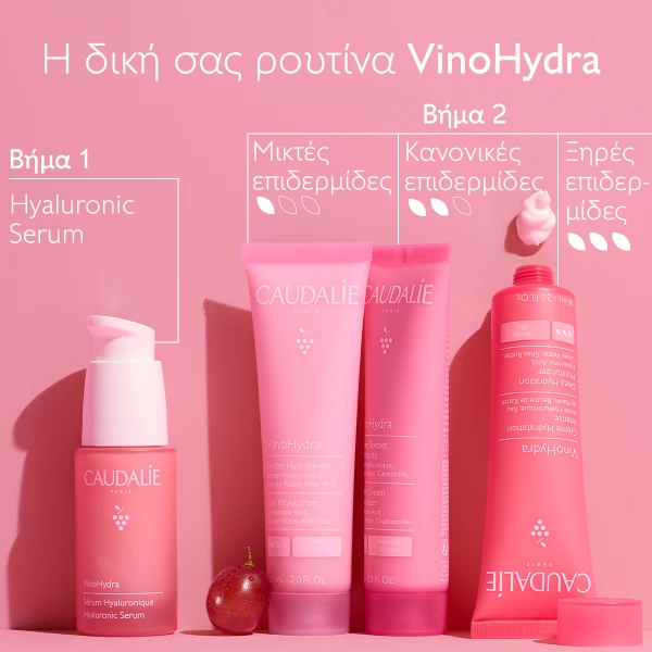 Το VinoHydra Hyaluronic Serum κλειδώνει και εμπλουτίζει με ενυδάτωση σε βάθος στην επιδερμίδα, με διάρκεια όλη την ημέρα.