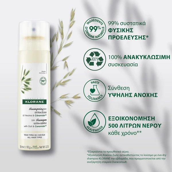 Το Klorane Dry shampoo με Βρώμη & Κεραμίδιαᴸᴵᴷᴱ σχεδιάστηκε ειδικά για λούσιμο χωρίς τη χρήση νερού. Η νέα του σύνθεση συνδυάζει μαλακτικό εκχύλισμα Βρώμης και Κεραμίδιαᴸᴵᴷᴱ με προστατευτική δράση και εξαιρετικά απορροφητικές πούδρες για τον καθαρισμό, την προστασία και την αναζωογόνηση των μαλλιών*, σε μόλις 2 λεπτά και για 12 ώρες, εξασφαλίζοντας 100% αόρατο τελείωμα. Μια ιδανική λύση για τα μαλλιά που επαναφέρει τη φρεσκάδα και την ελαφρότητα.