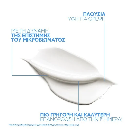 ΙΔΙΟΤΗΤΕΣ Τριπλή δράση χάρη στην ολοκληρωμένη σύνθεσή του: Αναπλάθει και επανορθώνει την επιδερμίδα: [Madecassoside] + [Χαλκός-Ψευδάργυρος-Μαγγάνιο] Καταπραΰνει τις ξηρές και ερεθισμένες περιοχές: [Προβιταμίνη Β5 5%] Προστατεύει και ανακουφίζει την επιδερμίδα: [Πλούσια, ενυδατική υφή] + [Υφή που αποτρέπει την προσκόλληση βακτηρίων] ΑΠΟΤΕΛΕΣΜΑΤΑ Το δέρμα αναπλάθεται, καταπραΰνεται και ανακτά την άνεσή της