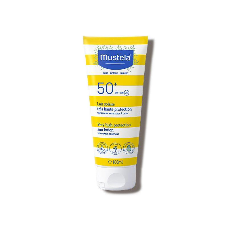 Αντιηλιακό προσώπου-σώματος πολύ υψηλής προστασίας Mustela® Very High Protection Sun Lotion με δείκτη SPF50+, που προστατεύει το ευαίσθητο, μη ανεκτικό, ατοπικό και το φωτοευαίσθητο δέρμα από τις ακτίνες UVΑ και UVB.