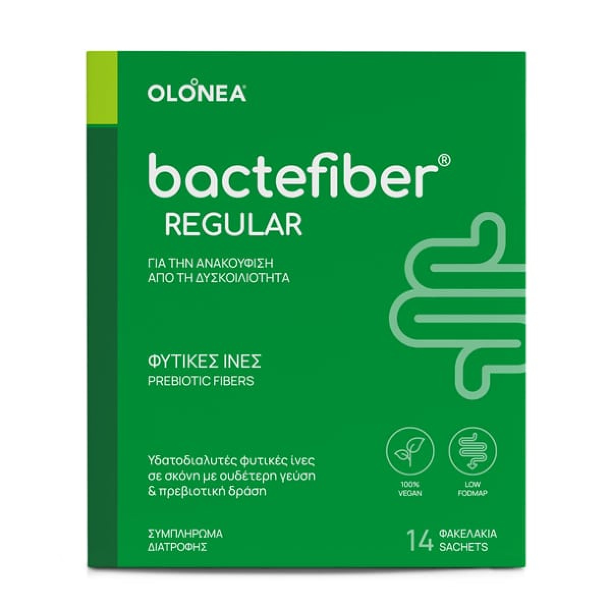 Το BacteFiber regular περιέχει πρεβιοτικές υδατοδιαλυτές φυτικές ίνες για την αποκατάσταση της φυσικής κινητικότητας του εντέρου και την ανακούφιση από τη δυσκοιλιότητα.