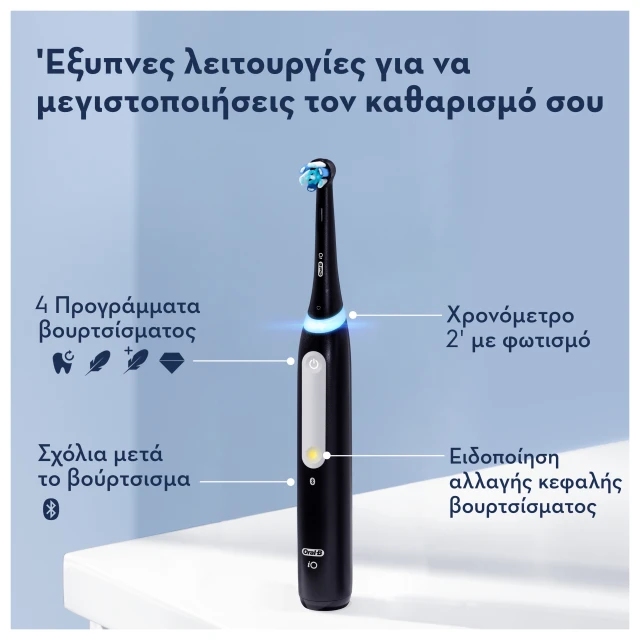 - Ο καλύτερος καθαρισμός της Oral-B με επαναστατική τεχνολογία iO για αίσθηση επαγγελματικού καθαρισμού κάθε μέρα. Συνδυάζει τη μοναδική στρογγυλή κεφαλή βουρτσίσματος της Oral-B με απαλές μικροδονήσεις για αίσθηση φρεσκάδας και καθαριότητας στο στόμα και 100% πιο υγιή ούλα σε μία εβδομάδα σε σύγκριση με μια απλή χειροκίνητη οδοντόβουρτσα.