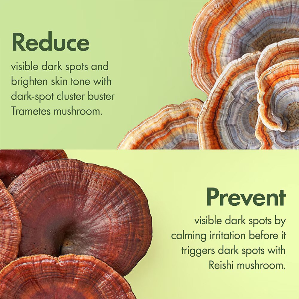 Αυτή η φόρμουλα με μανιτάρια μειώνει ορατά τις κηλίδες και φωτίζει τον τόνο του δέρματος με βιταμίνη C φυτικής προέλευσης και μανιτάρι Trametes. Το Reishi και το ζυμωμένο Chaga βοηθούν στην καταπράυνση των ερεθισμών και στην πρόληψη της ορατής υπερμελάγχρωσης στο δέρμα, ενώ το υαλουρονικό οξύ ενυδατώνει και ενισχύει τον επιδερμικό φραγμό.