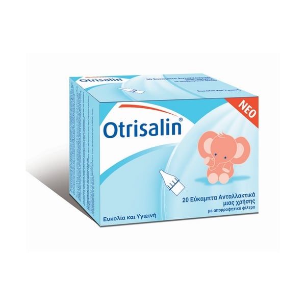 Η συκευασία ανταλλακτικών Otrisalin περιέχει 20 εύκαμπτα ανταλλακτικά ακροφύσια μιας χρήσης με απορροφητικό φίλτρο που χρησιμοποιούνται με τη Συσκευή Ρινικής Απόφραξης Otrisalin για μωρά (η συσκευή ρινικής απόφραξης πωλείται ξεχωριστά).