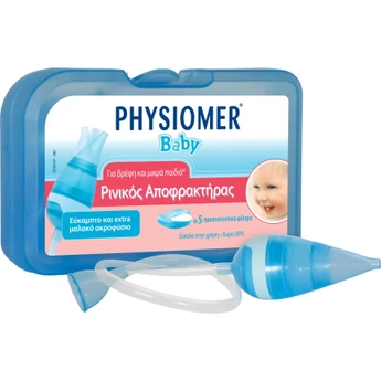 Ο Ρινικός Αποφρακτήρας PHYSIOMER® BABY διαθέτει εύκαμπτο και extra μαλακό ακροφύσιο που προσαρμόζει στη μύτη του μωρού. Το διάφανο σώμα του σας επιτρέπει να ελέγχετε την ποσότητα της βλέννης κατά την εισρόφηση. Είναι εύκολο στη χρήση και μπορεί να πλυθεί και να ξαναχρησιμοποιηθεί για να διασφαλιστεί η υγιεινή. Δεν περιέχει BPA.