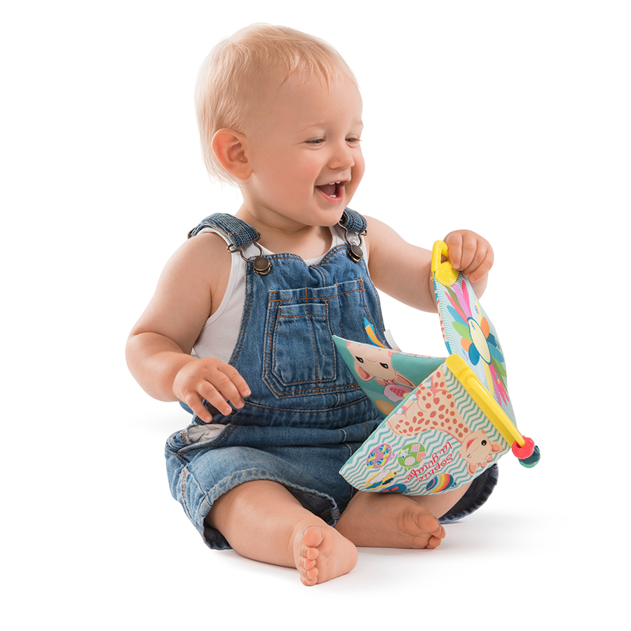 Θα ανακαλύψει πολλές δραστηριότητες: ένα χερούλι άβακα και 3 χάντρες για να μετακινεί, μια σφυριχτρούλα που είναι κρυμμένη στην πρώτη σελίδα, διάφορα υλικά για να εξερευνήσει, έντονα και με αντίθεση χρώματα, 2 μαλακά μέρη για να μασουλάει και να ανακουφίζει τα πονεμένα του ούλα.