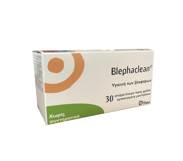 Συσκευασία με 30 αποστειρωμένα, προεμποτισμένα μαντηλάκια έτοιμα για τον καθαρισμό και την αναζωογόνηση των βλεφάρων και των βλεφαρικών χειλέων.