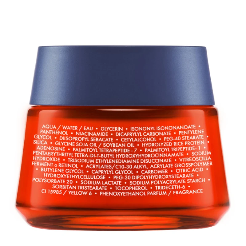 Aqua / Water / Eau • Glycerin • Isononyl Isononanoate • Panthenol • Niacinamide • Dicaprylyl Carbonate • Pentylene Glycol • Diisopropyl Sebacate • Cetylalcohol • Peg-40 Stearate • Silica • Glycine Soja Oil / Soybean Oil • Hydrolyzed Rice Protein • Adenosine • Palmitoyl Tetrapeptide – 7 • Palmitoyl Tripeptide- 1 • Pentaerythrityl Tetra-Di-T-Butyl Hydroxyhydrocinnamate • Sodium Hydroxide • Trisodium Ethylenediamine Disuccinate • Vitreoscilla Ferment O Retinol • Acrylates/C10-30 Alkyl, Acrylate Grosspolymer • Butylene Glycol • Caprylyl Glycol • Carbomer • Citric Acid • Hydroxyethylcellulose • Peg-30 Dipolyhydroxystearate • Polysorbate 20 • Sodium Lactate • Sodium Polyacrylate Starch • Sorbitan Tristearate • Tocopherol • Trideceth-6 • Ci 15985 / Yellow 6 • Phenoxyethanol Parfum / Fragrance.